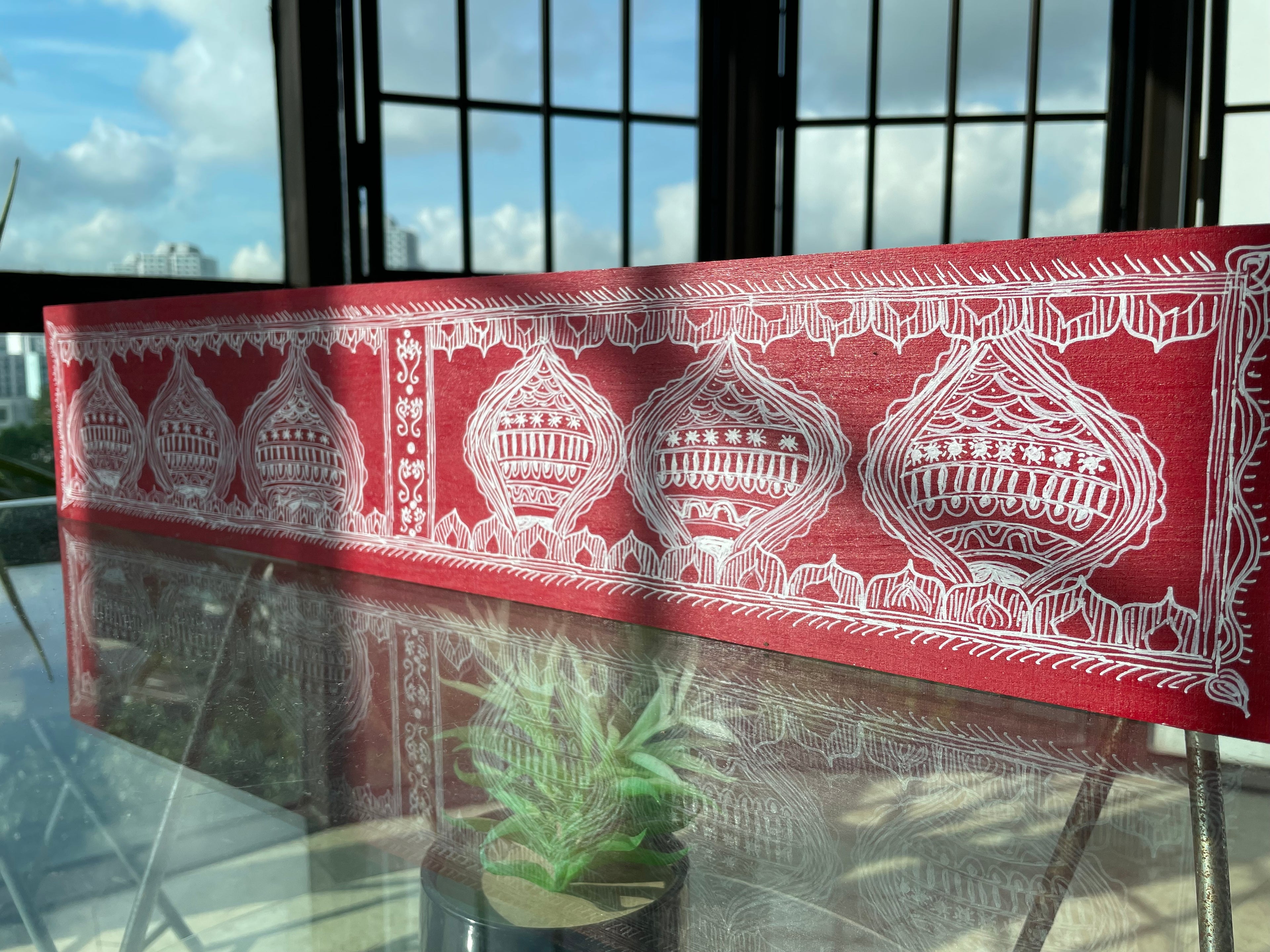 Aipan (Ēpaṇ) is an almost 1000 years old religious folk art native to the Kumaon region of Uttarakhand, India. It reflects deep harmony with nature. The motifs of the sun, the moon, water, lotus, conch shell, parrots, fish and animals are made with various designs and patterns. The word Aipan is a derivative of Arpan, a commonly used word for ‘Likhai (writing)’ even though it is made from fingers.